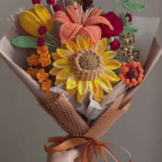 The finished bouquet height is kept between about 16 and 20 inches. All the flower stems are bent as needed for the arrangement; they are made with waterproof wire wrapped in yarn by hand, so you can adjust the stem length to your liking by bending them shorter or extending them longer.